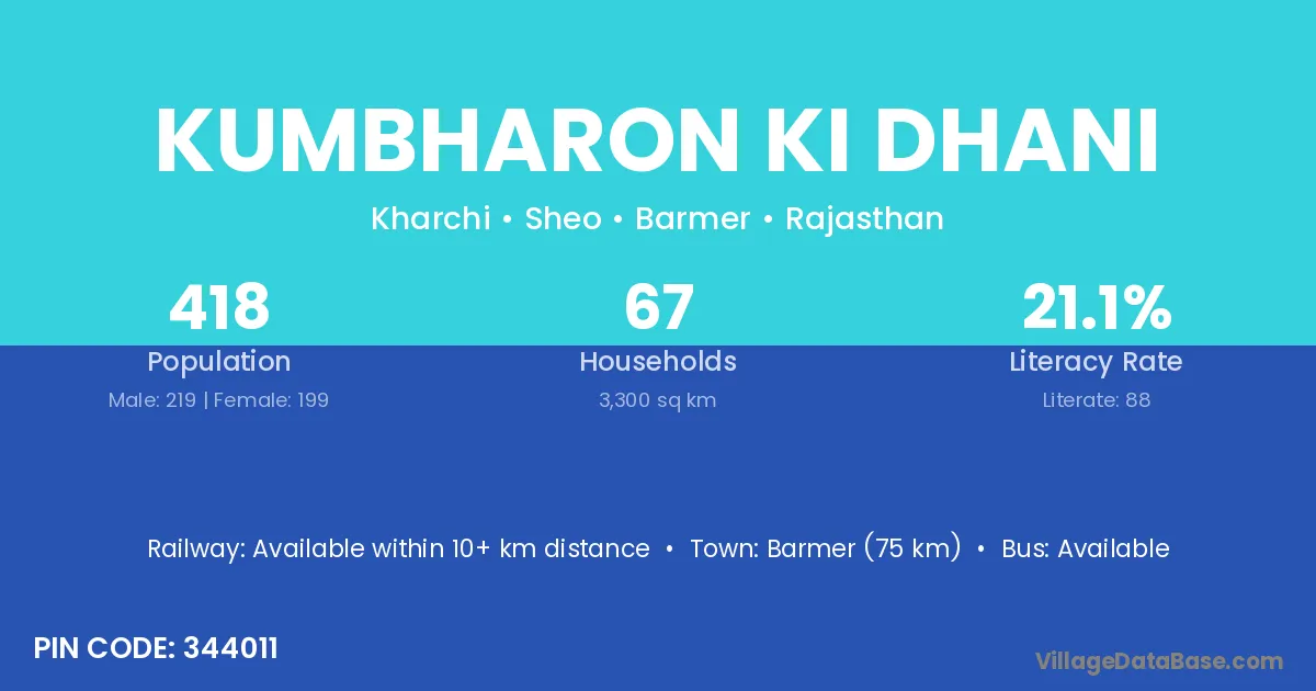 Barmer (75 km) is the nearest town to Kumbharon Ki Dhani village for major economic activities and is located approximately 75 km away.