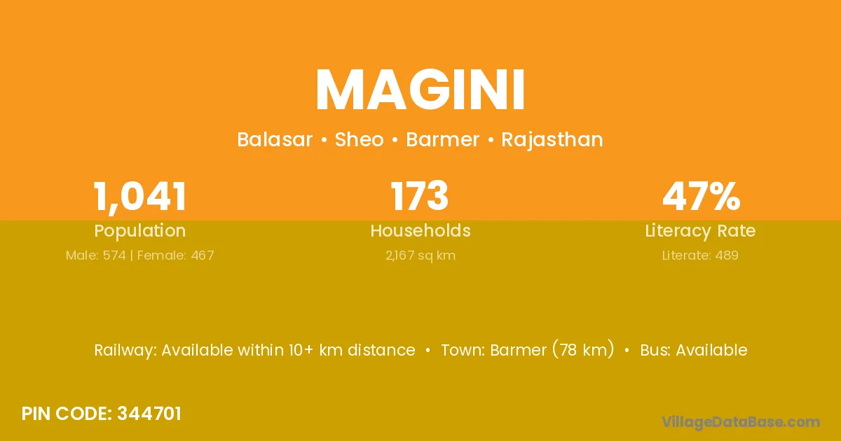 Barmer (78 km) is the nearest town to Magini village for major economic activities and is located approximately 78 km away.