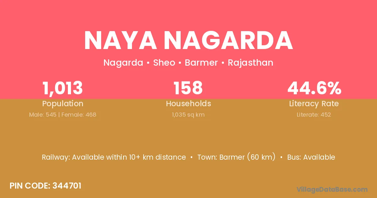 Barmer (60 km) is the nearest town to Naya Nagarda village for major economic activities and is located approximately 60 km away.
