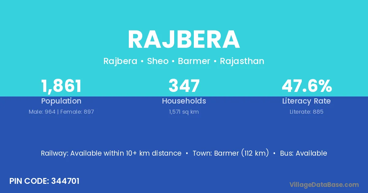 Barmer (112 km) is the nearest town to Rajbera village for major economic activities and is located approximately 112 km away.