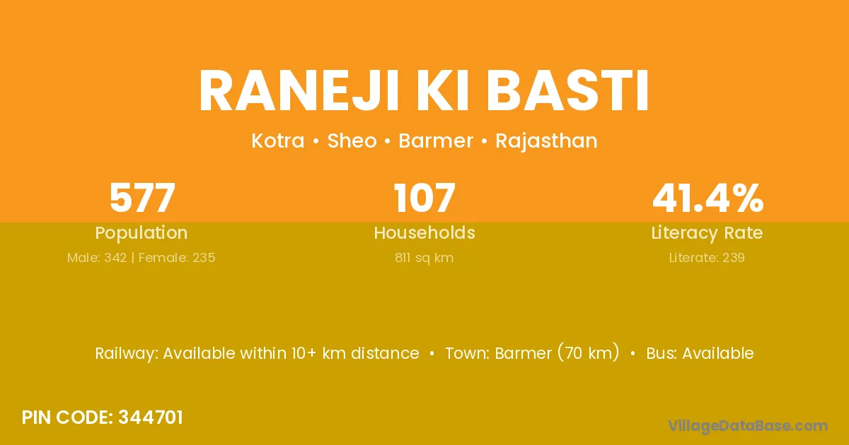 Barmer (70 km) is the nearest town to Raneji Ki Basti village for major economic activities and is located approximately 70 km away.
