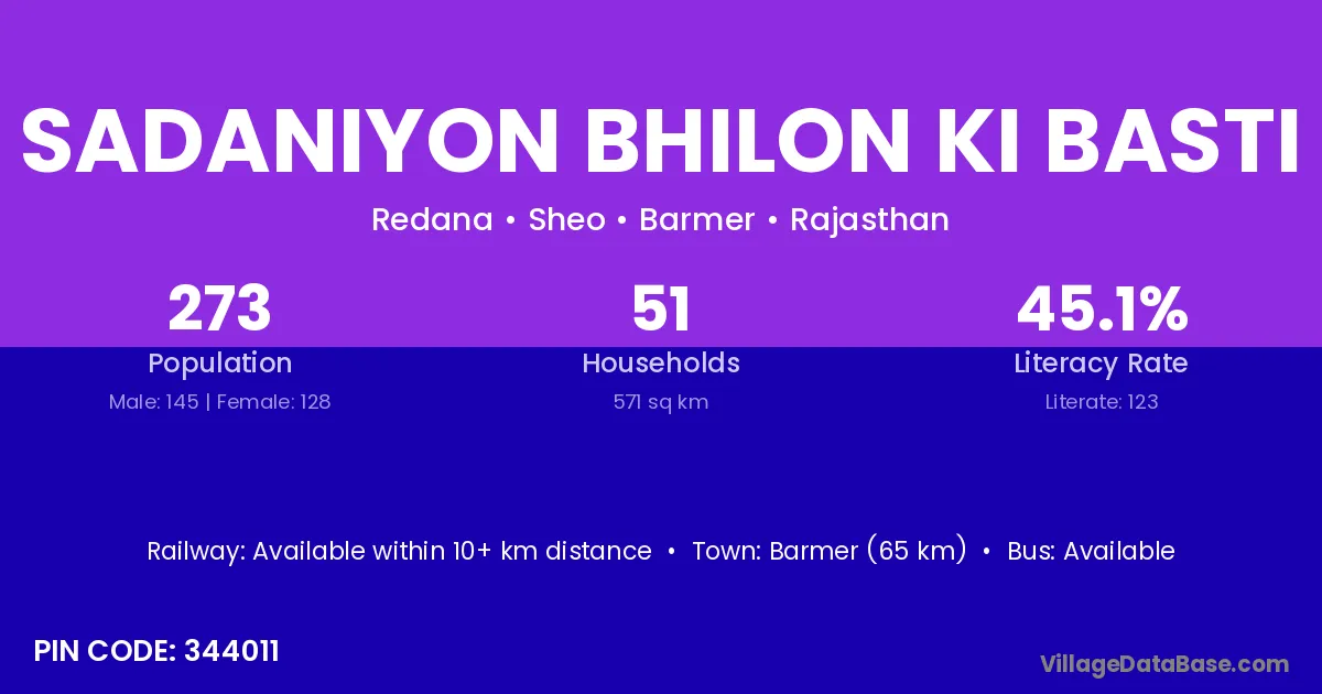 Sadaniyon Bhilon Ki Basti village has a total population of 273 people, of which 145 are males and 128 are females.
