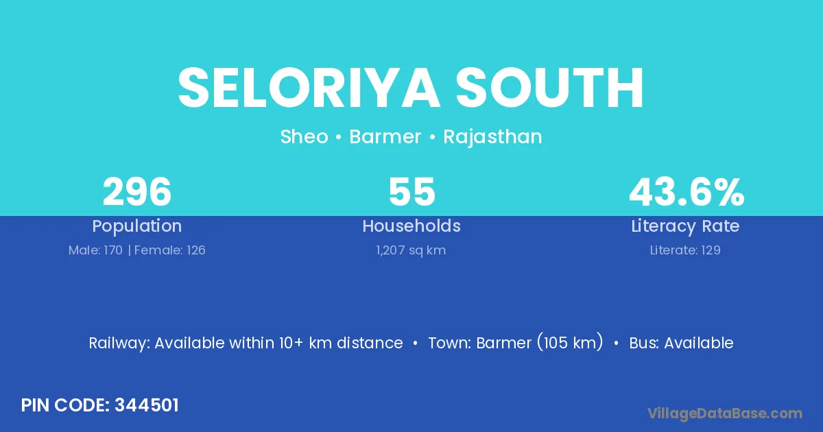 Barmer (105 km) is the nearest town to Seloriya South village for major economic activities and is located approximately 105 km away.
