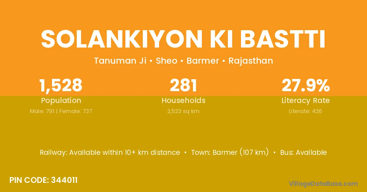 Barmer (107 km) is the nearest town to Solankiyon Ki Bastti village for major economic activities and is located approximately 107 km away.