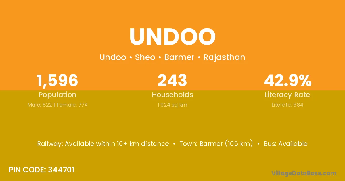 Barmer (105 km) is the nearest town to Undoo village for major economic activities and is located approximately 105 km away.