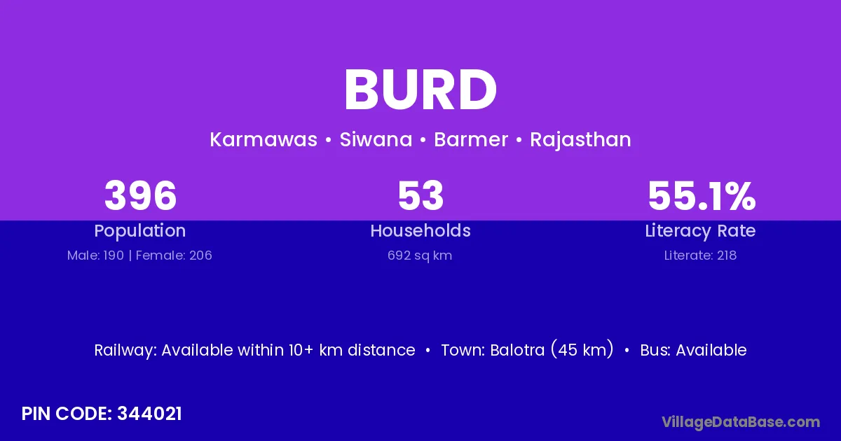 Balotra (45 km) is the nearest town to Burd village for major economic activities and is located approximately 45 km away.