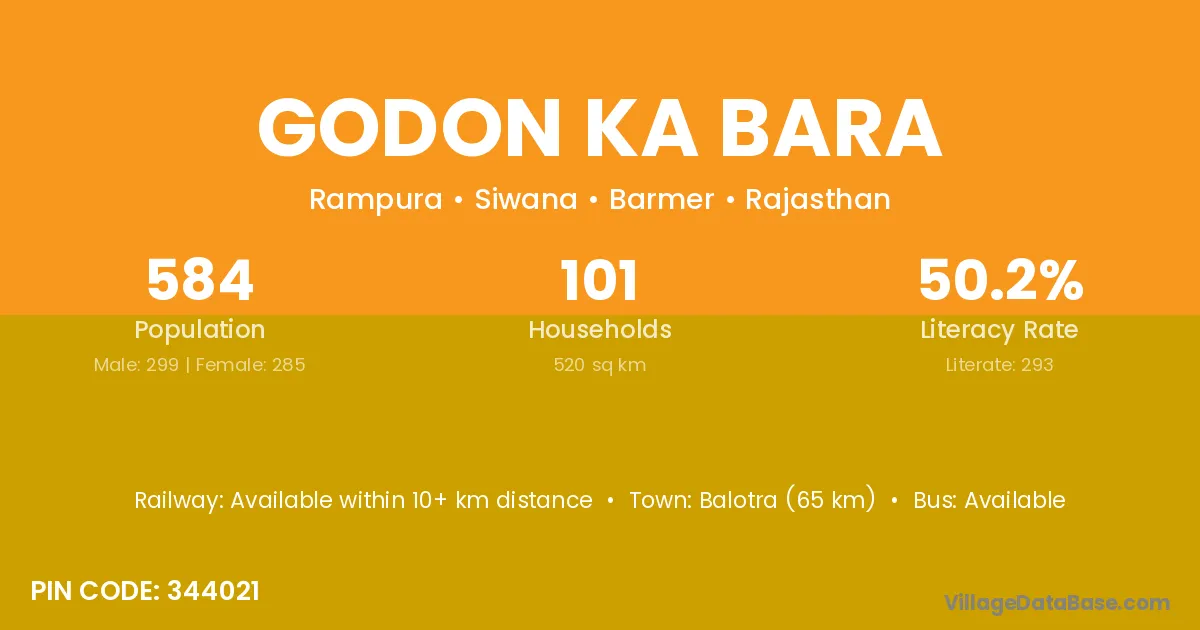 Balotra (65 km) is the nearest town to Godon Ka Bara village for major economic activities and is located approximately 65 km away.