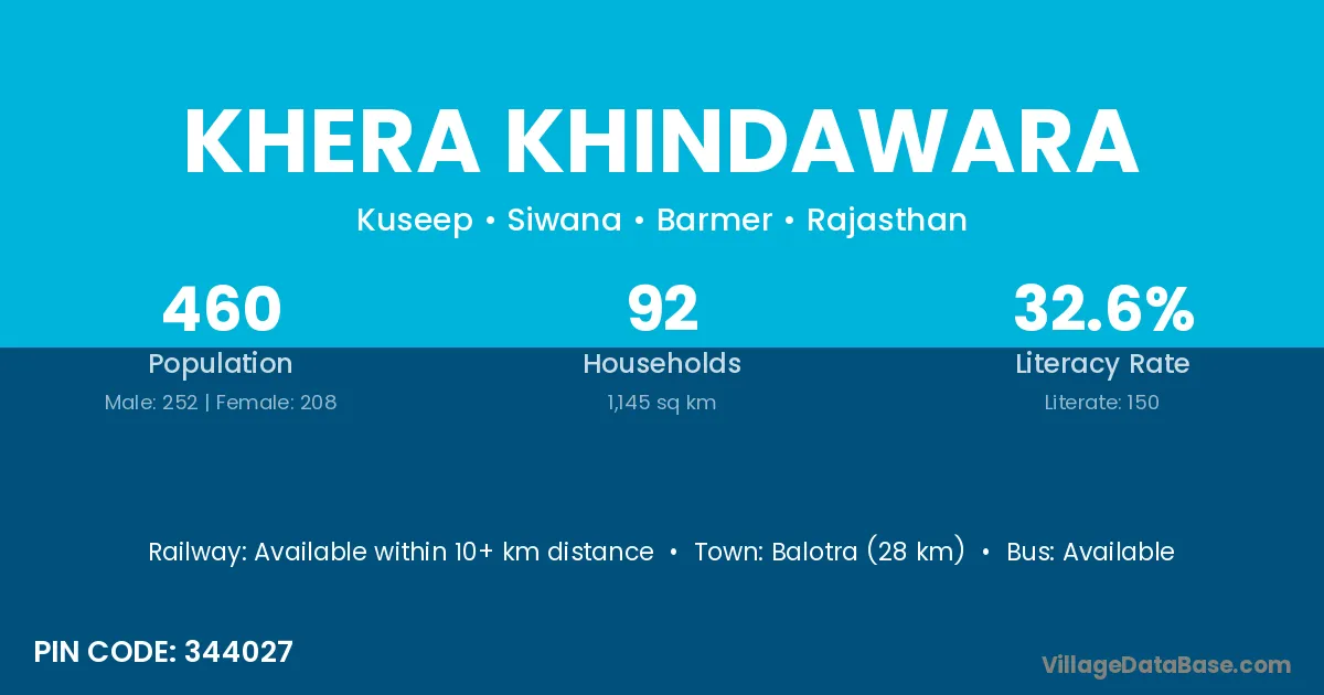 Balotra (28 km) is the nearest town to Khera Khindawara village for major economic activities and is located approximately 28 km away.