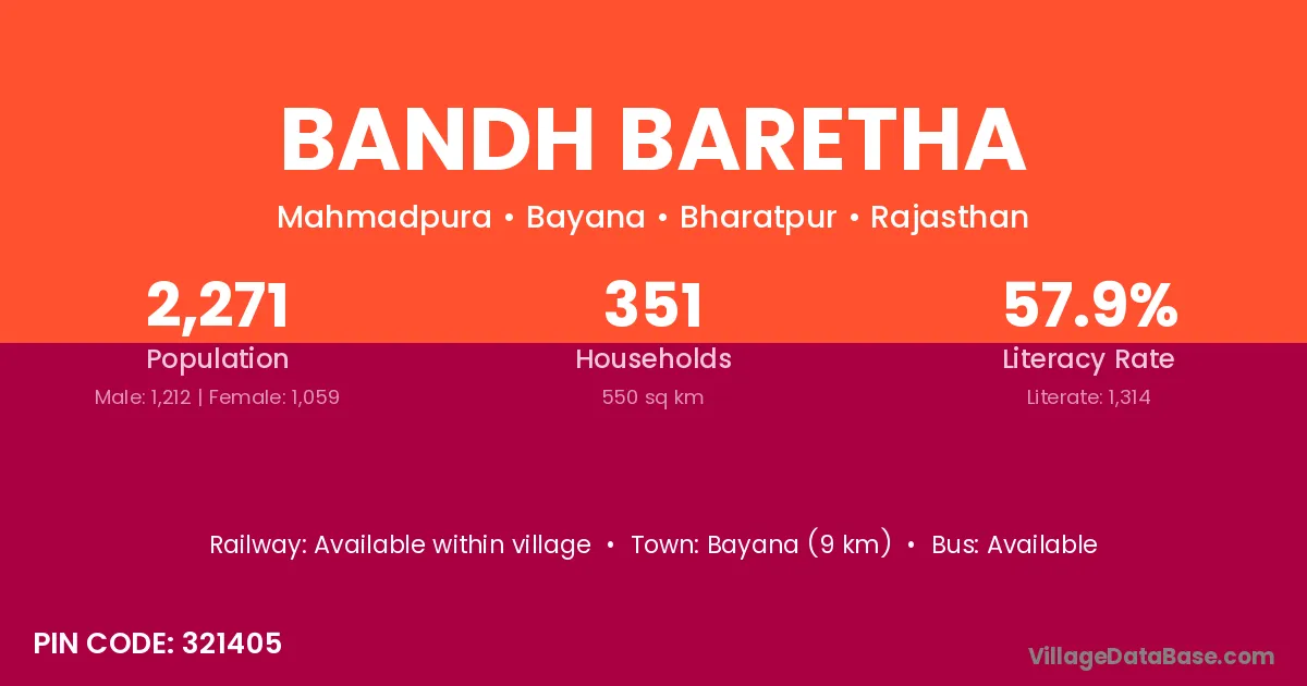 Bayana (9 km) is the nearest town to Bandh Baretha village for major economic activities and is located approximately 9 km away.