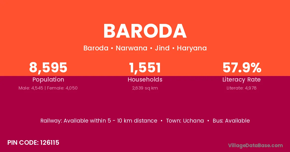 Bayana (15 km) is the nearest town to Baroda village for major economic activities and is located approximately 15 km away.