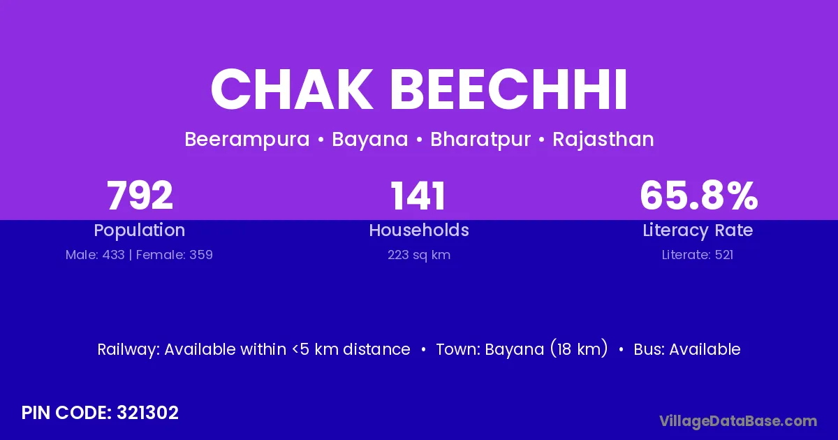 Bayana (18 km) is the nearest town to Chak Beechhi village for major economic activities and is located approximately 18 km away.