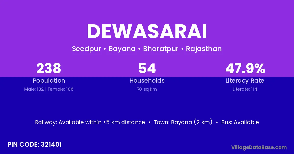 Bayana (2 km) is the nearest town to Dewasarai village for major economic activities and is located approximately 2 km away.