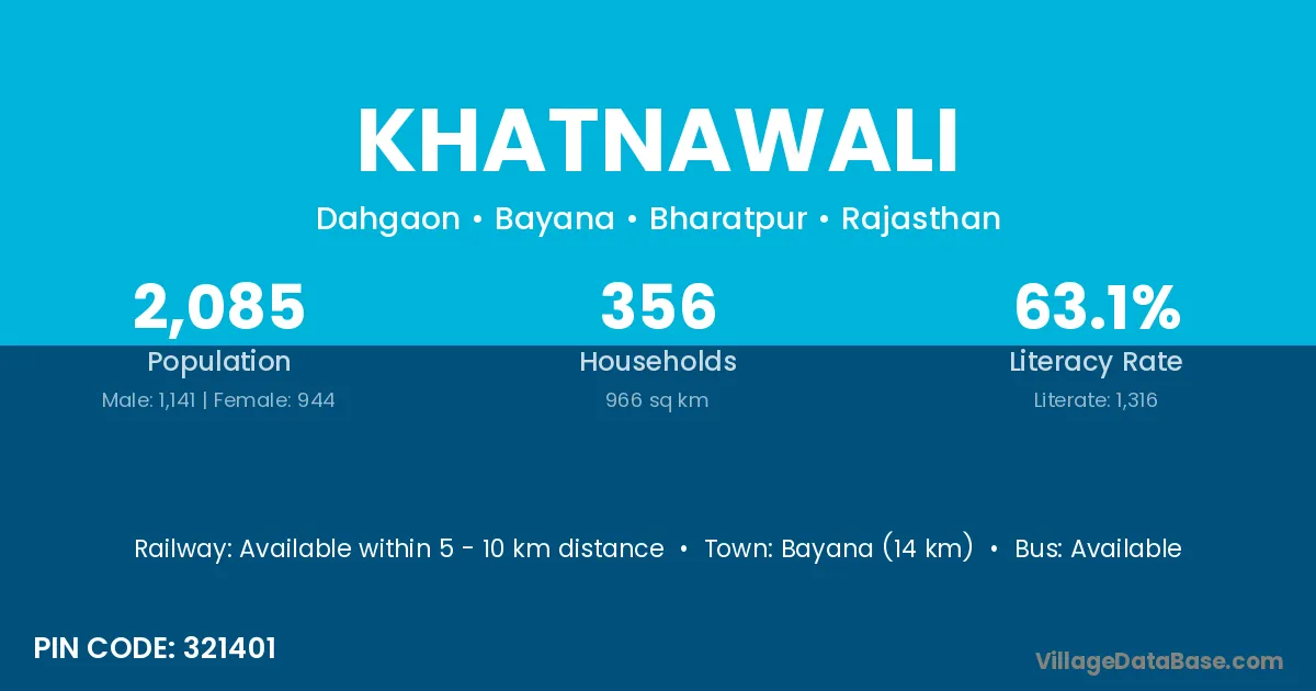 Bayana (14 km) is the nearest town to Khatnawali village for major economic activities and is located approximately 14 km away.