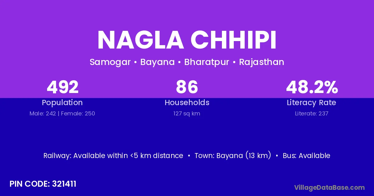 Bayana (13 km) is the nearest town to Nagla Chhipi village for major economic activities and is located approximately 13 km away.