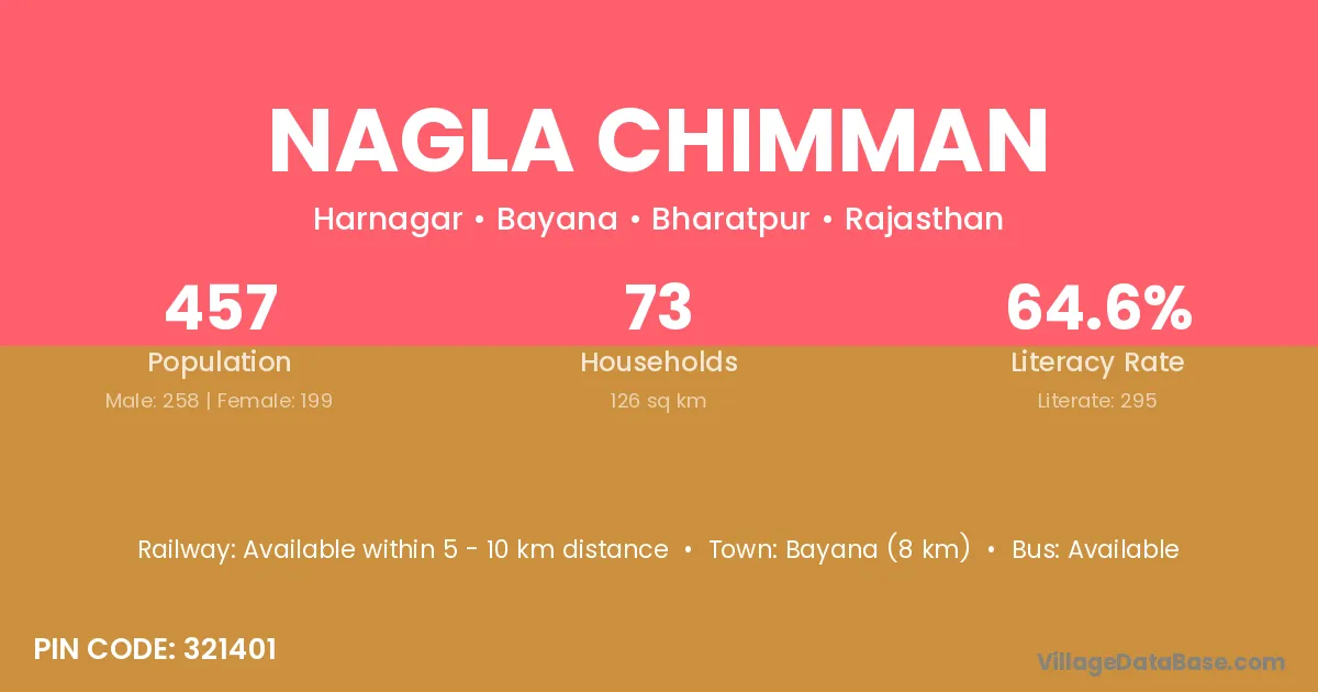 Bayana (8 km) is the nearest town to Nagla Chimman village for major economic activities and is located approximately 8 km away.