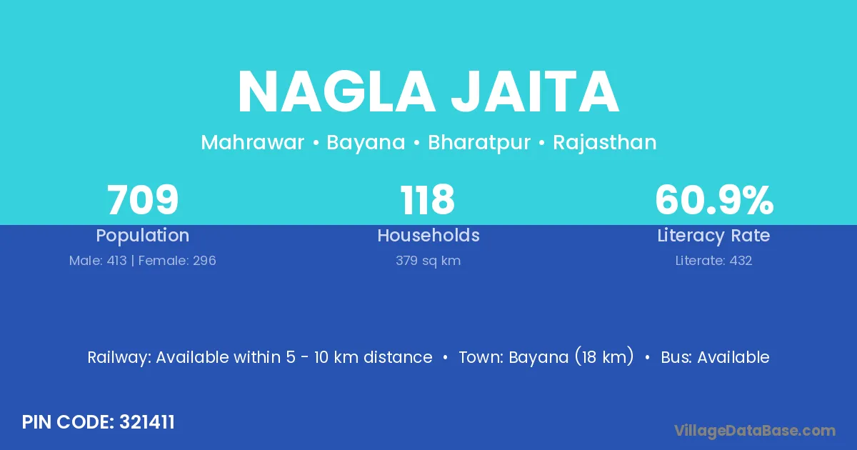 Bayana (18 km) is the nearest town to Nagla Jaita village for major economic activities and is located approximately 18 km away.