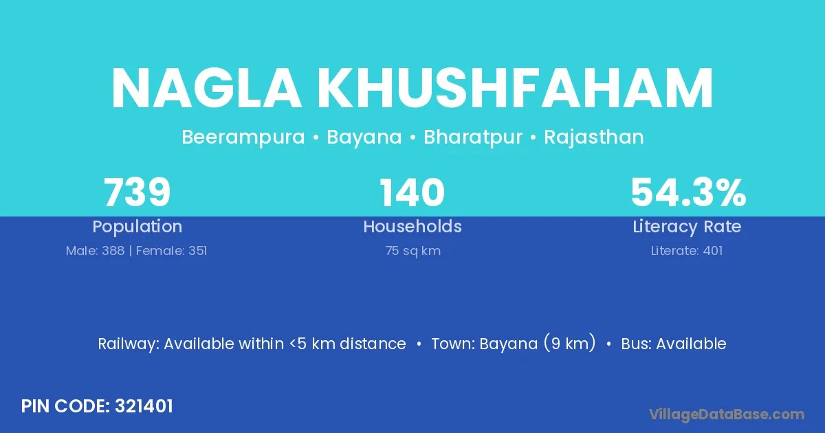 Bayana (9 km) is the nearest town to Nagla Khushfaham village for major economic activities and is located approximately 9 km away.