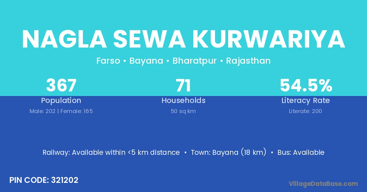 Nagla Sewa Kurwariya village has a total population of 367 people, of which 202 are males and 165 are females.