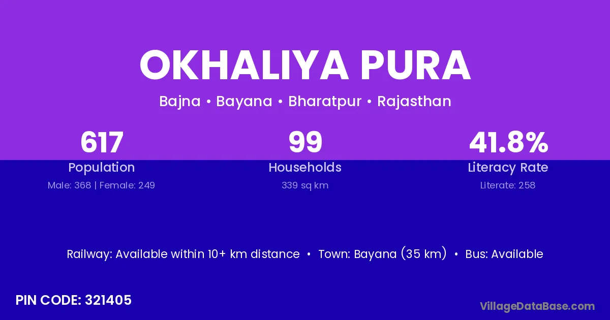 Bayana (35 km) is the nearest town to Okhaliya Pura village for major economic activities and is located approximately 35 km away.