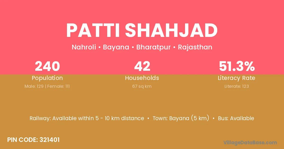 Bayana (5 km) is the nearest town to Patti Shahjad village for major economic activities and is located approximately 5 km away.