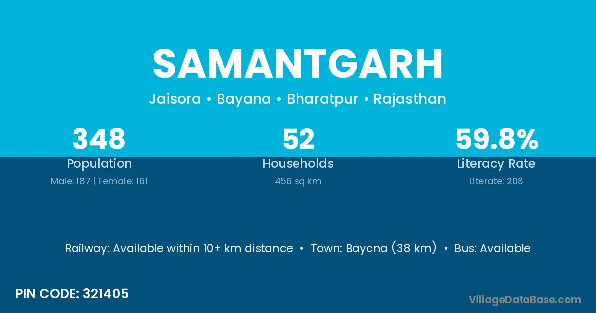 Bayana (38 km) is the nearest town to Samantgarh village for major economic activities and is located approximately 38 km away.