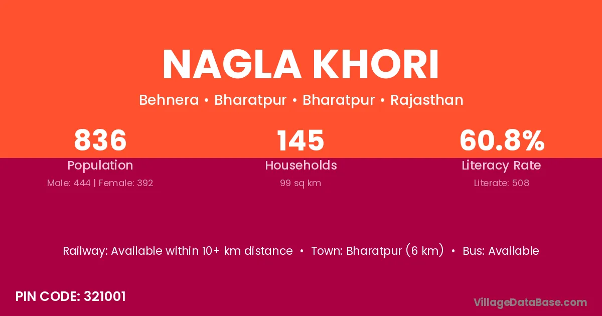 Bharatpur (6 km) is the nearest town to Nagla Khori village for major economic activities and is located approximately 6 km away.