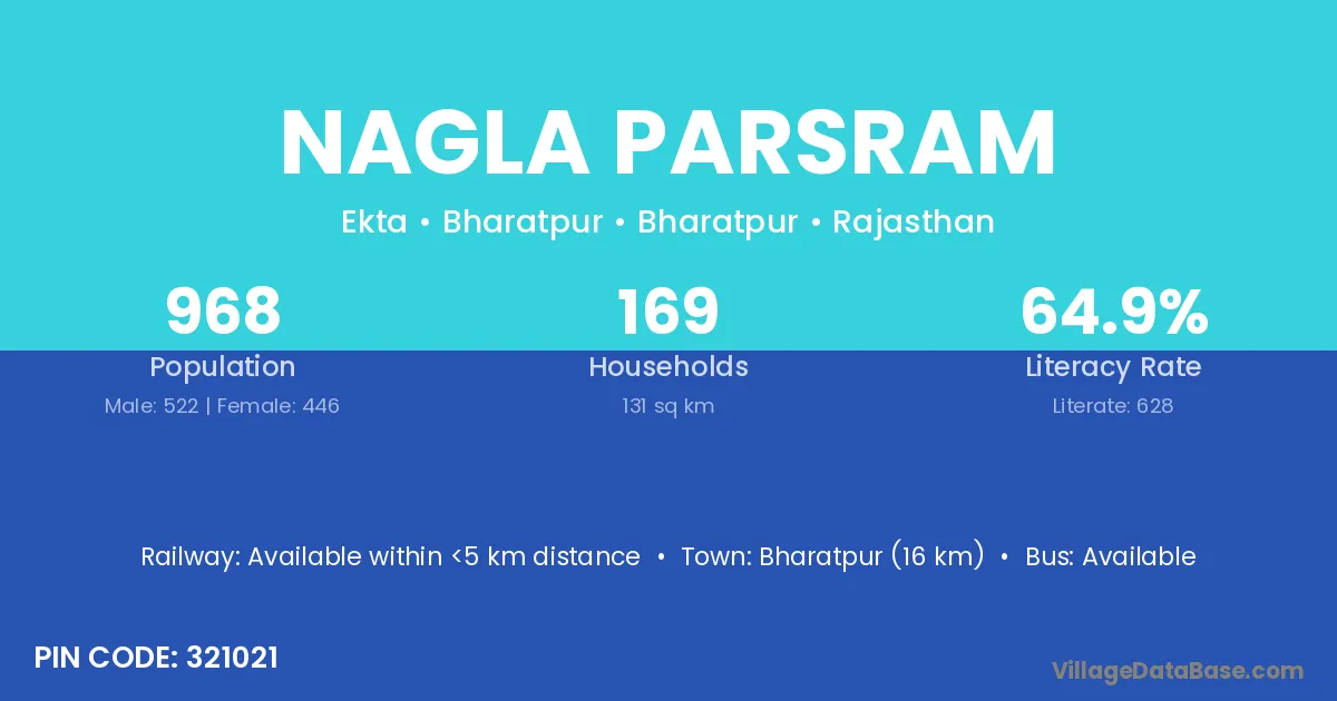 Bharatpur (16 km) is the nearest town to Nagla Parsram village for major economic activities and is located approximately 16 km away.