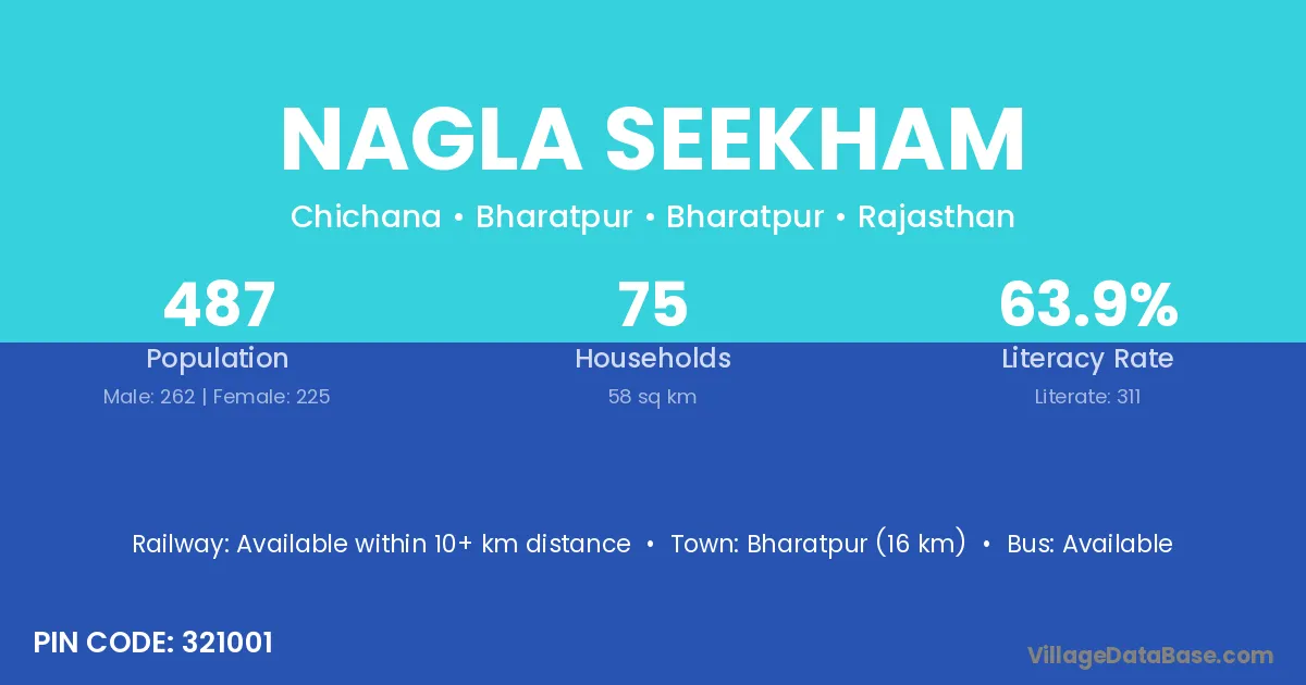 Bharatpur (16 km) is the nearest town to Nagla Seekham village for major economic activities and is located approximately 16 km away.