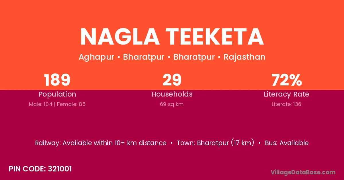 Bharatpur (17 km) is the nearest town to Nagla Teeketa village for major economic activities and is located approximately 17 km away.