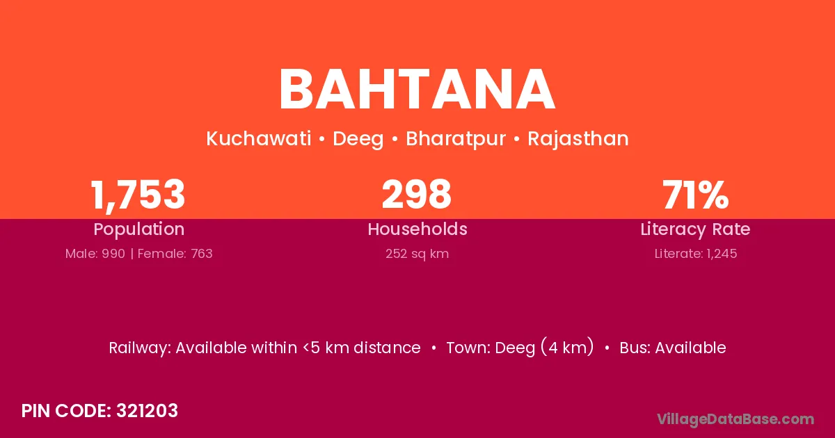 Deeg (4 km) is the nearest town to Bahtana village for major economic activities and is located approximately 4 km away.