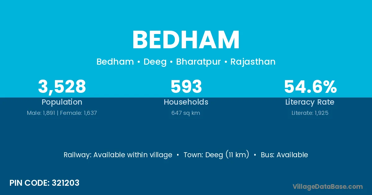 Deeg (11 km) is the nearest town to Bedham village for major economic activities and is located approximately 11 km away.