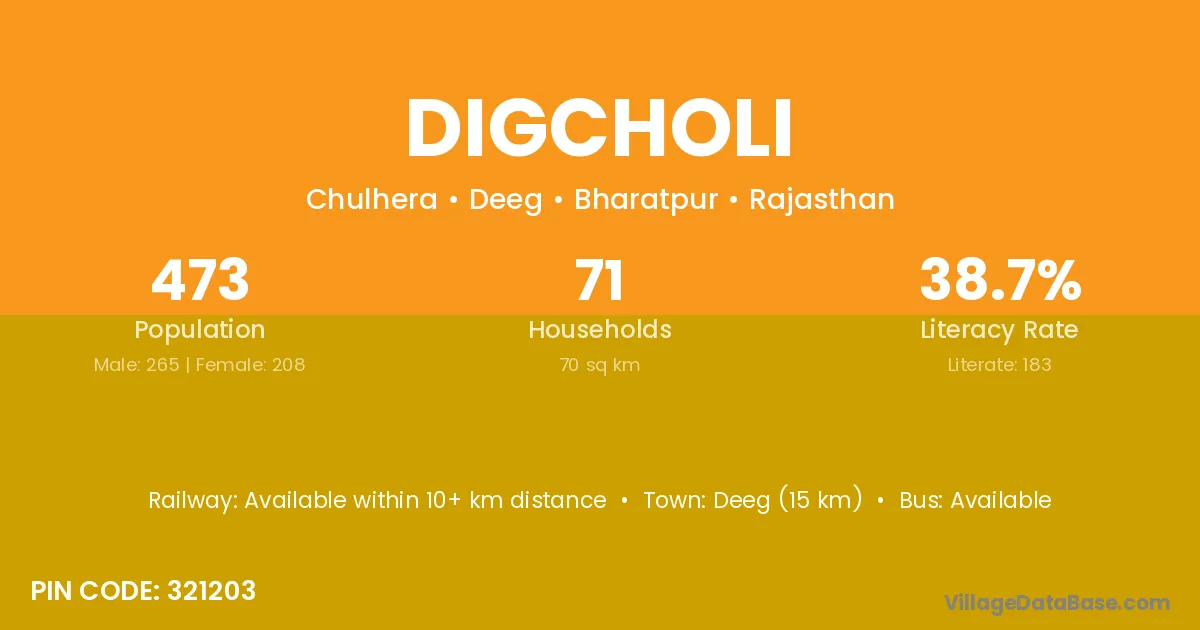 Deeg (15 km) is the nearest town to Digcholi village for major economic activities and is located approximately 15 km away.