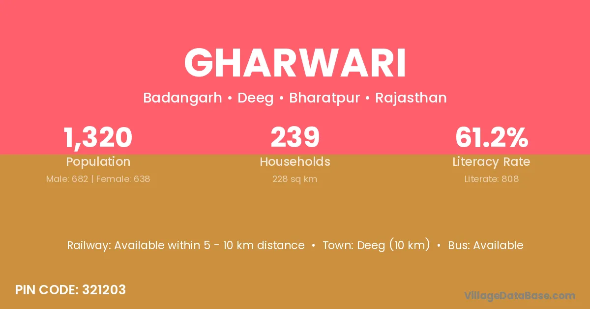 Deeg (10 km) is the nearest town to Gharwari village for major economic activities and is located approximately 10 km away.