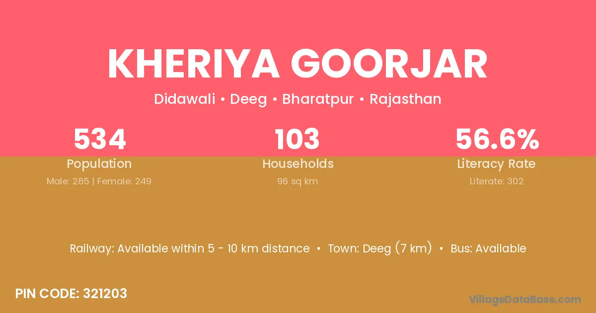 Deeg (7 km) is the nearest town to Kheriya Goorjar village for major economic activities and is located approximately 7 km away.