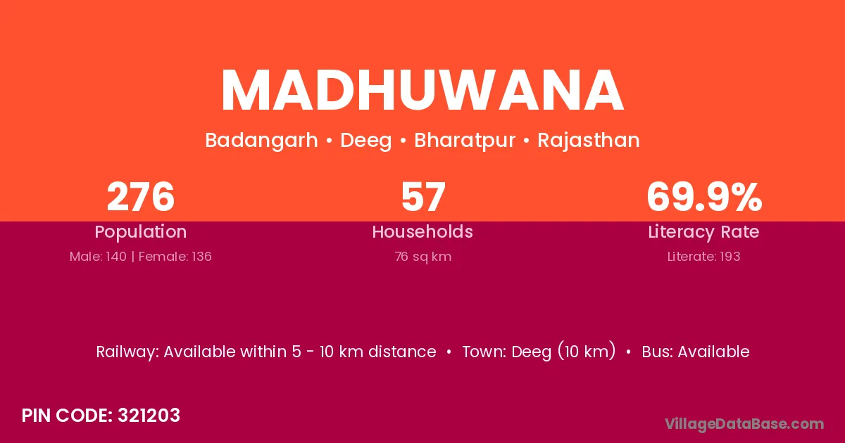 Deeg (10 km) is the nearest town to Madhuwana village for major economic activities and is located approximately 10 km away.