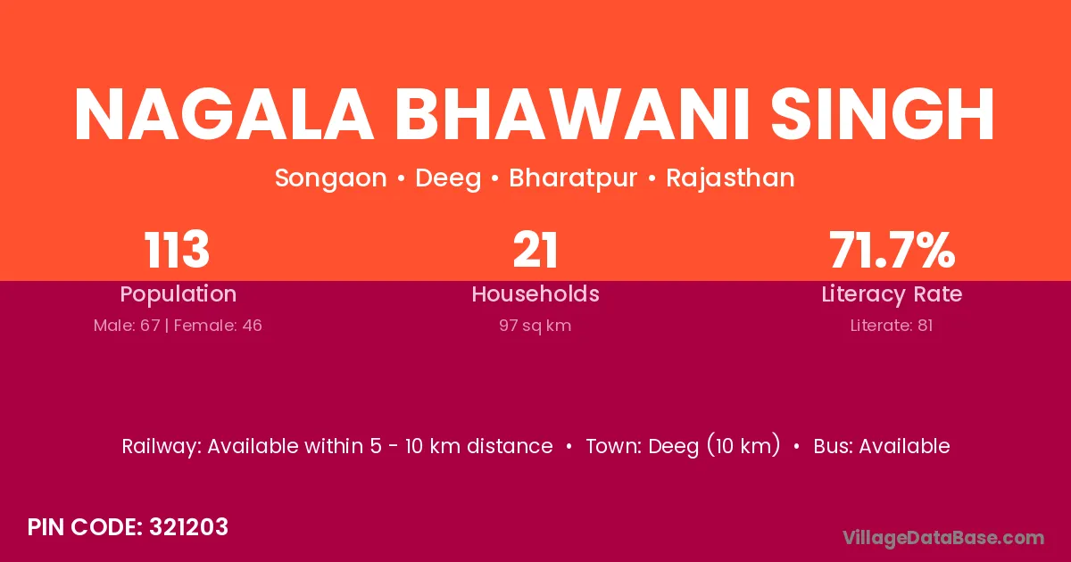 Deeg (10 km) is the nearest town to Nagala Bhawani Singh village for major economic activities and is located approximately 10 km away.