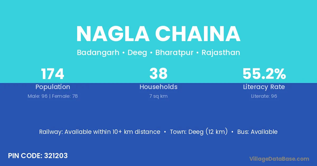 Deeg (12 km) is the nearest town to Nagla Chaina village for major economic activities and is located approximately 12 km away.