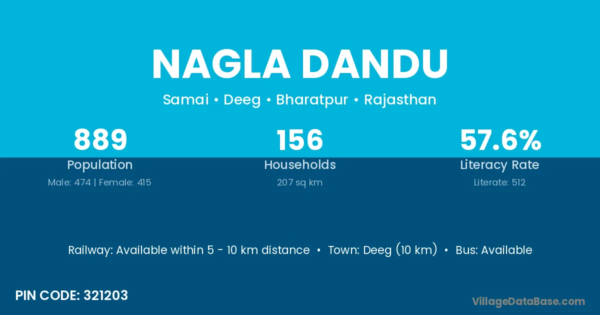 Deeg (10 km) is the nearest town to Nagla Dandu village for major economic activities and is located approximately 10 km away.