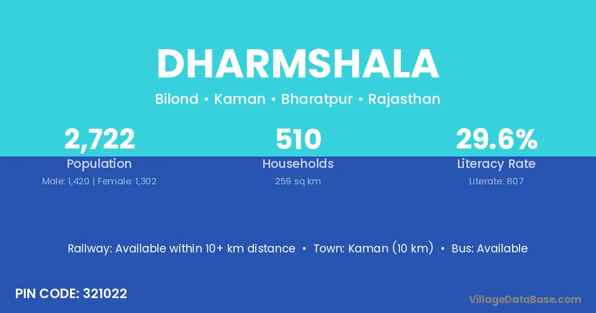 Kaman (10 km) is the nearest town to Dharmshala village for major economic activities and is located approximately 10 km away.