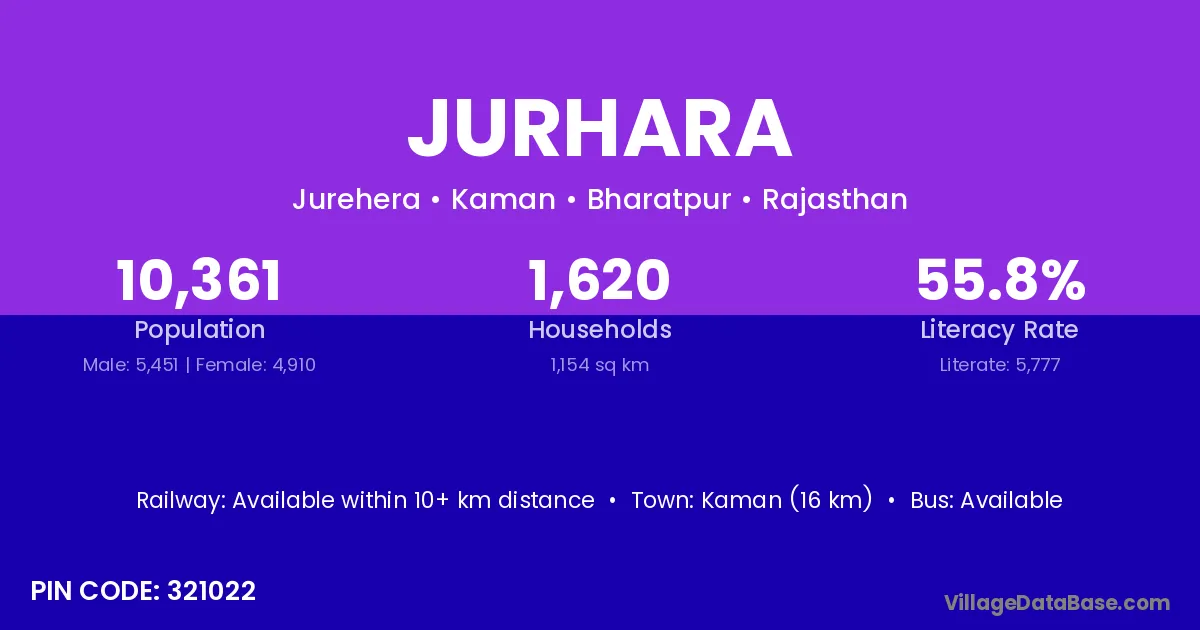 Kaman (16 km) is the nearest town to Jurhara village for major economic activities and is located approximately 16 km away.