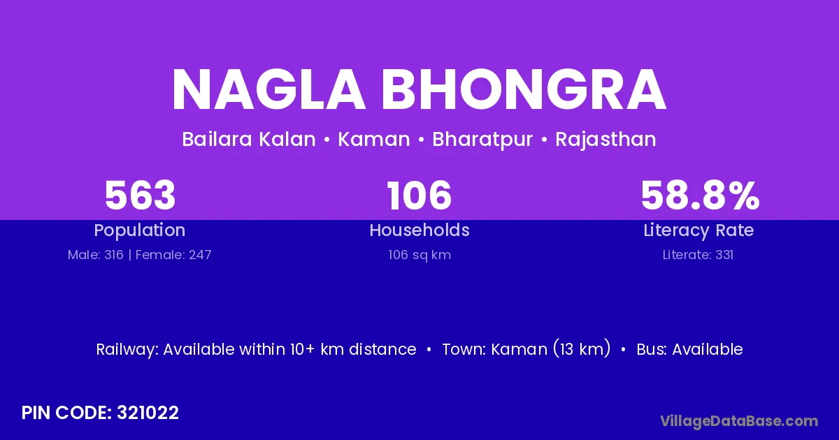 Kaman (13 km) is the nearest town to Nagla Bhongra village for major economic activities and is located approximately 13 km away.
