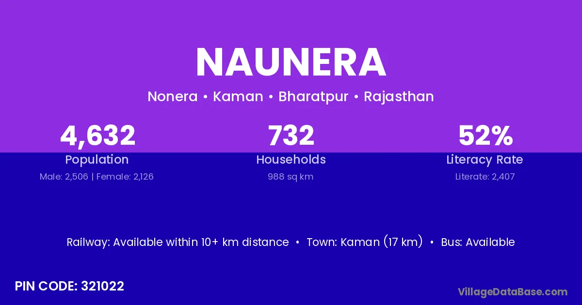 Kaman (17 km) is the nearest town to Naunera village for major economic activities and is located approximately 17 km away.