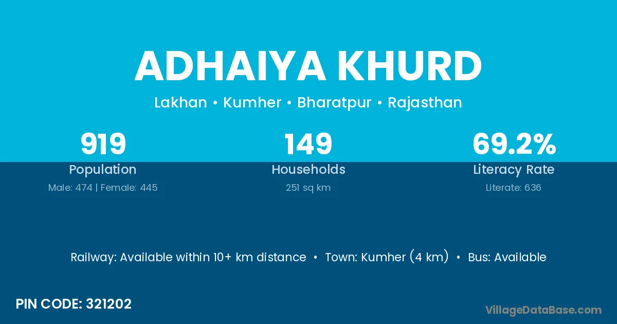 Kumher (4 km) is the nearest town to Adhaiya Khurd village for major economic activities and is located approximately 4 km away.