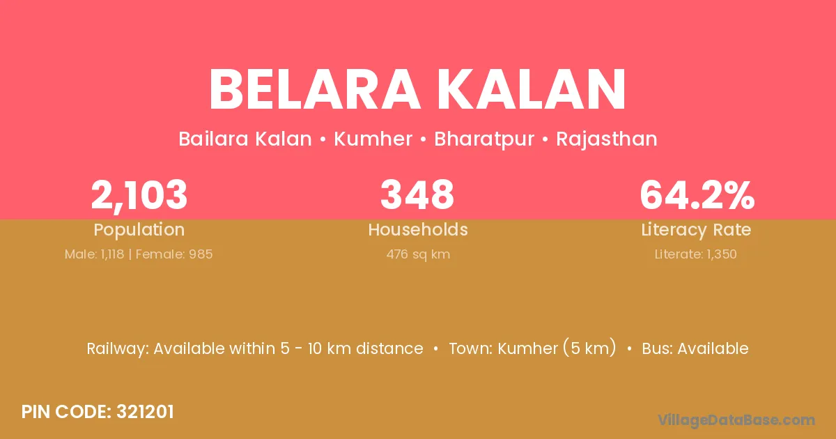 Kumher (5 km) is the nearest town to Belara Kalan village for major economic activities and is located approximately 5 km away.