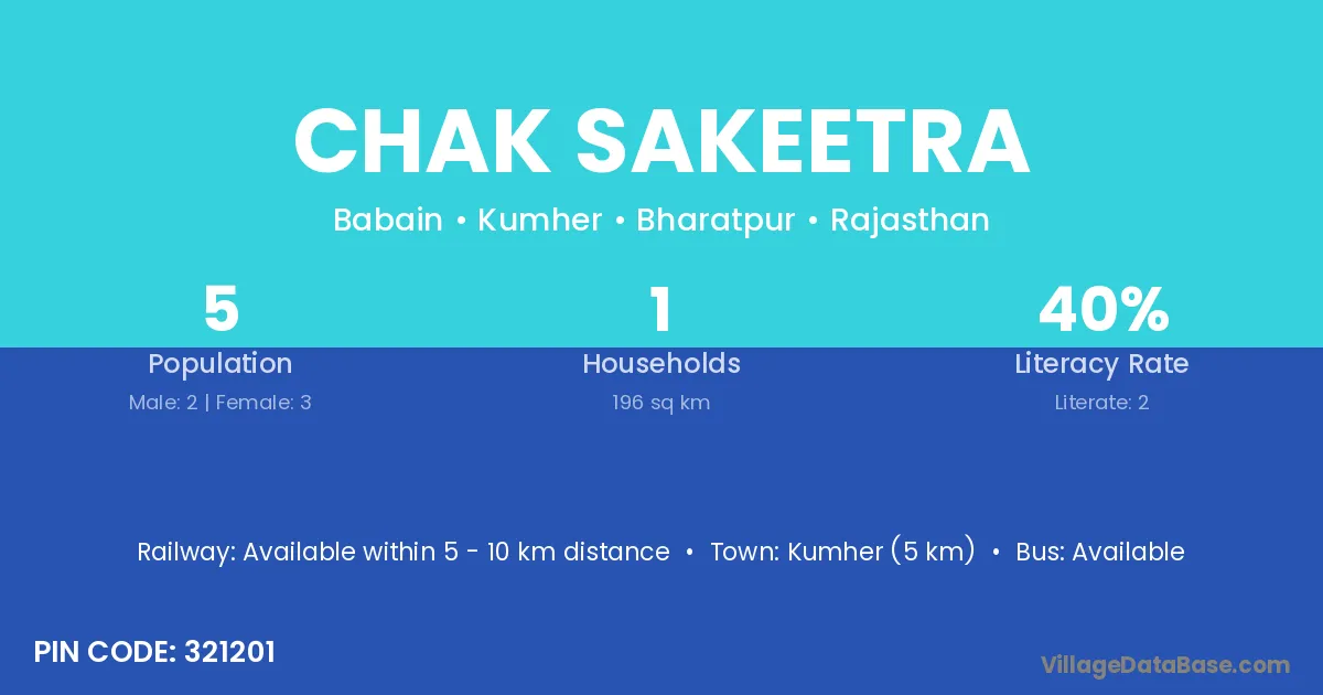 Chak Sakeetra village has a total population of 5 people, of which 2 are males and 3 are females.