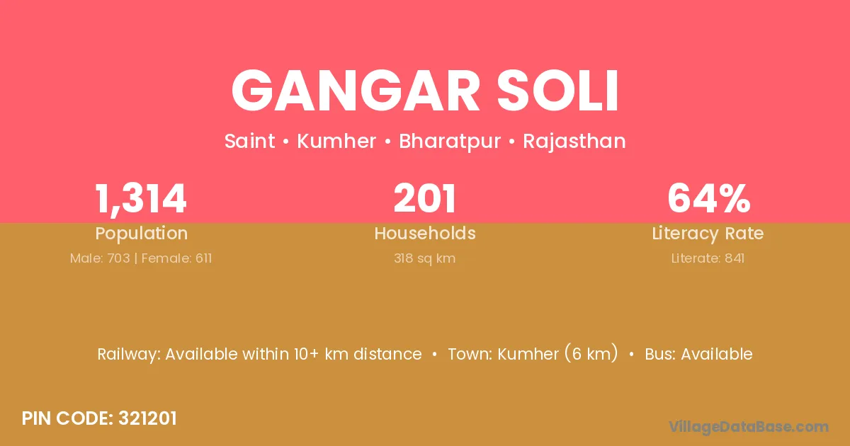 Gangar Soli village has a total population of 1,314 people, of which 703 are males and 611 are females.