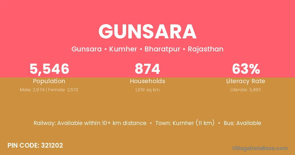 Kumher (11 km) is the nearest town to Gunsara village for major economic activities and is located approximately 11 km away.