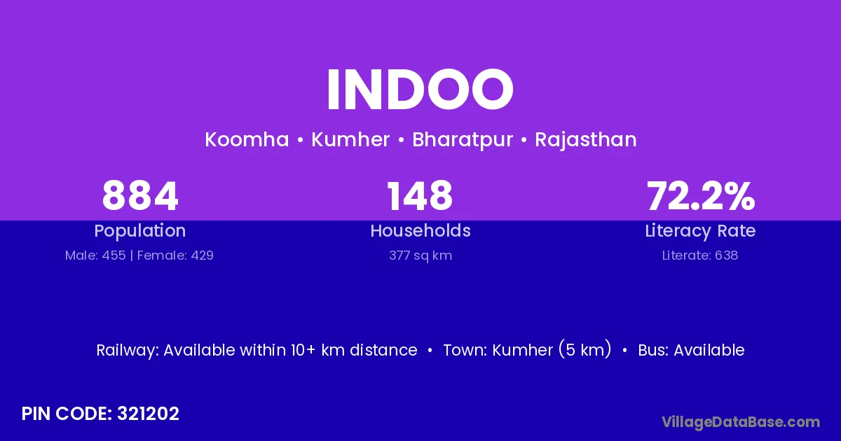 Kumher (5 km) is the nearest town to Indoo village for major economic activities and is located approximately 5 km away.