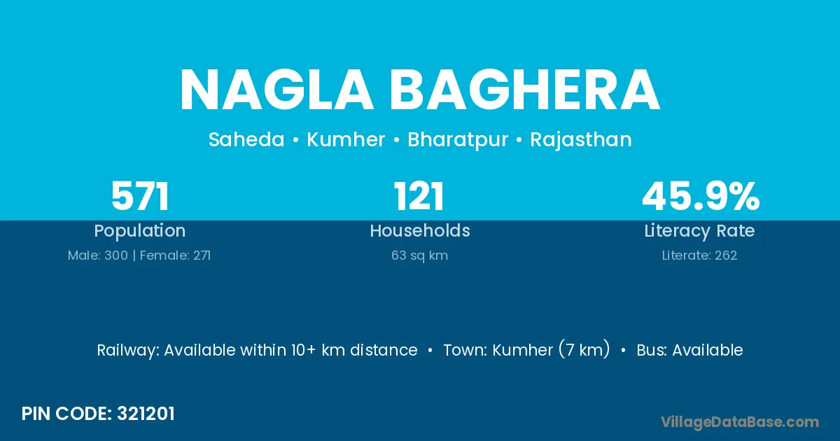 Kumher (7 km) is the nearest town to Nagla Baghera village for major economic activities and is located approximately 7 km away.