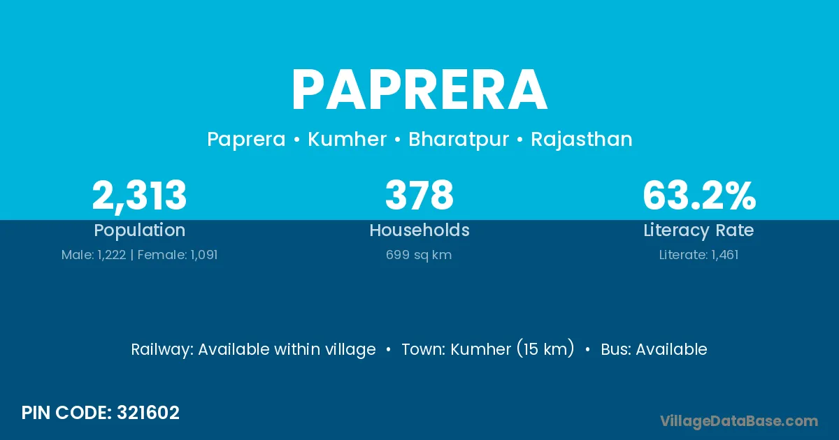 Kumher (15 km) is the nearest town to Paprera village for major economic activities and is located approximately 15 km away.